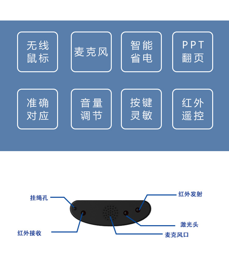 自主研發(fā)集遙控器、鼠標、麥克風、翻頁器、激光筆于一體,支持課件翻頁、課堂擴音等課堂操作功能,產(chǎn)品自帶鋰電池,續(xù)航時間長達8小時,紅外傳輸距離可達20米。