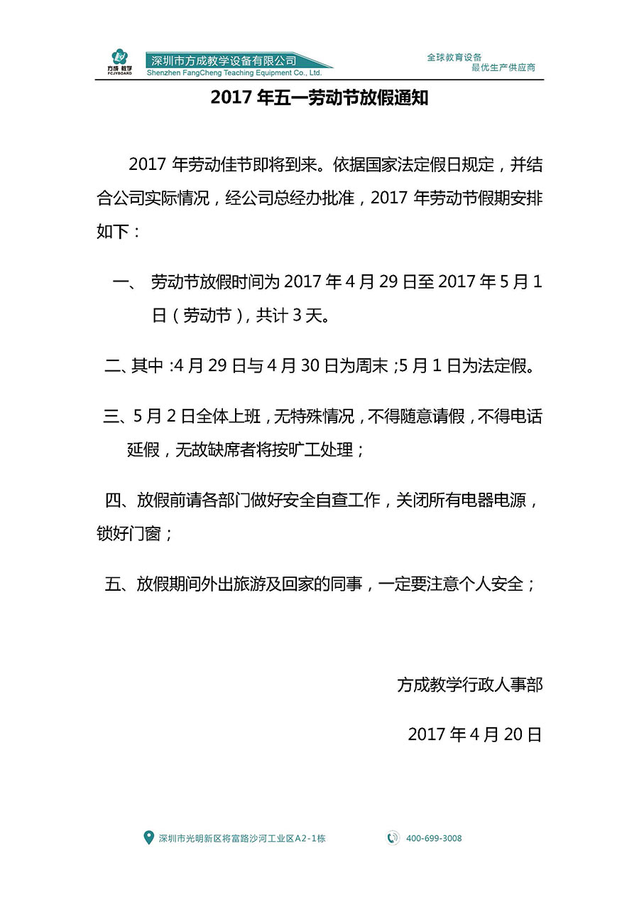 2017年勞動(dòng)佳節(jié)即將到來(lái)。依據(jù)國(guó)家法定假日規(guī)定,并結(jié)合公司實(shí)際情況,經(jīng)公司總經(jīng)辦批準(zhǔn),2017年勞動(dòng)節(jié)
