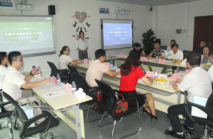 參觀期間,各位領導認真聽取我們美女講師對方成教學一系列硬件產品的講解,其中包括壁掛一體機、交互式電子白板、白板一體