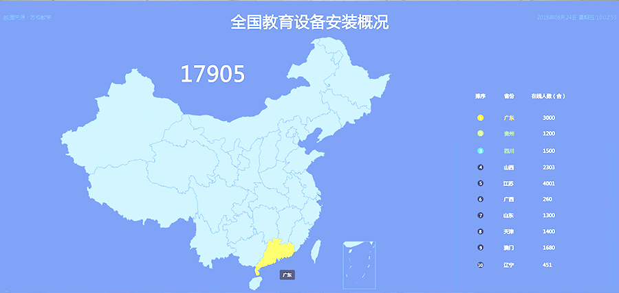 設備集控軟件,用于教學設備的班、校、縣、市、區、省的逐級管理。教育部門可以通過設備集控軟件中的設備地圖查看本地區所