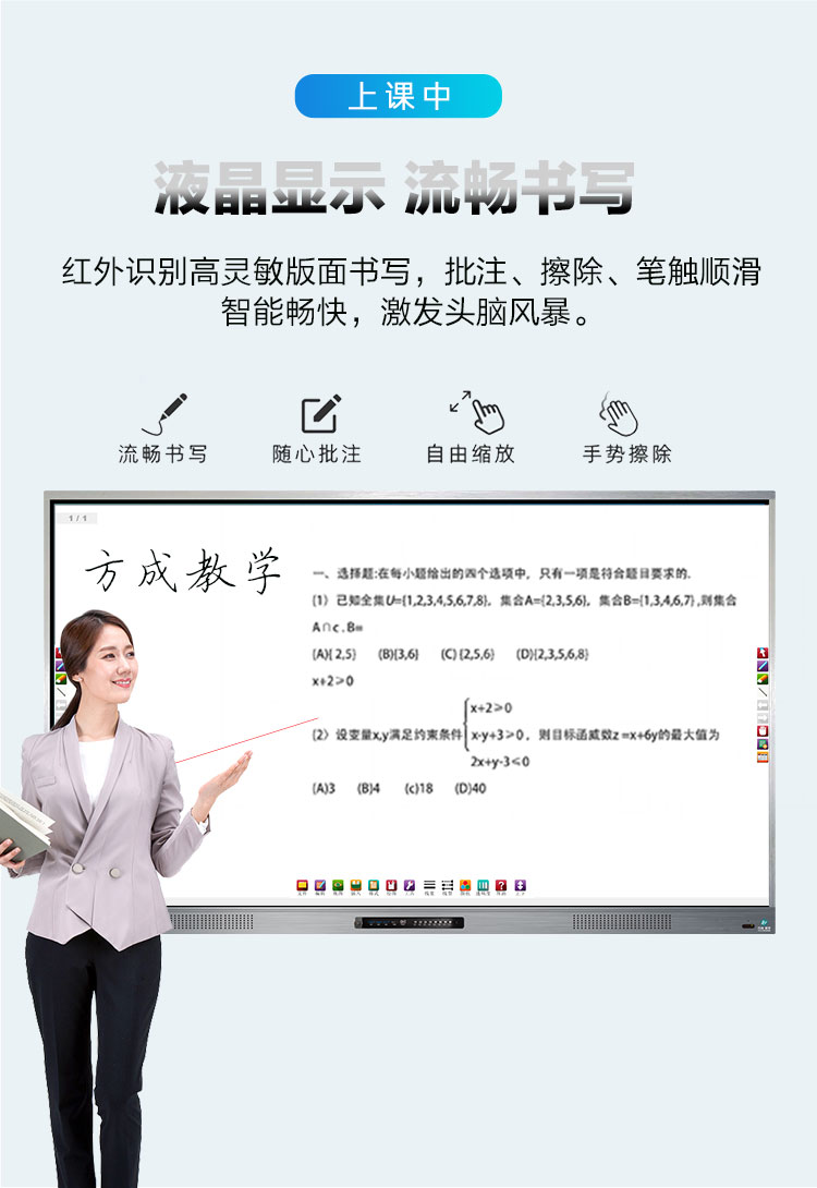 超窄邊多媒體教學(xué)一體機(jī)-超窄邊框三等邊超窄邊框設(shè)計(jì),推拉門鎖保護(hù),4K超高清顯示,以人機(jī)交互的方式,搭載互動白板和無線投屏軟件,實(shí)現(xiàn)多人書寫、互聯(lián)互通的互動教學(xué)模式,豐富課堂內(nèi)容,提高學(xué)習(xí)氛圍。